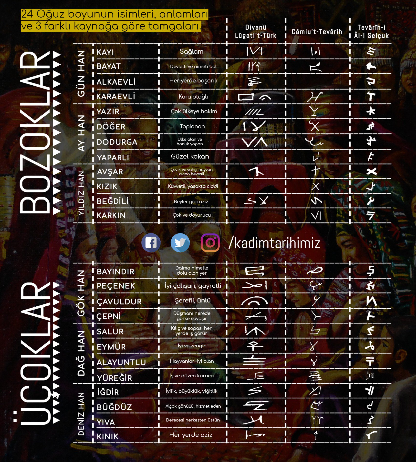 Tarih I Kadim On Twitter 24 Oguz Boyunun Isimleri Anlamlari Ve 3 Farkli Kaynaga Gore Tamgalari 2 Oguz Boyu O Donemde 11 Yy Henuz Musluman Olmadiklari Gerekcesiyle Kasgarli Mahmud Tarafindan Listeye Alinmasa Da