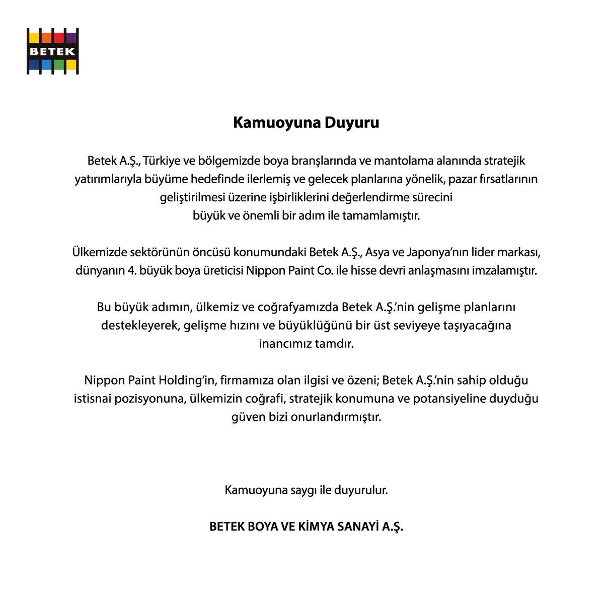 Betek Boya Dan Hisse Devri Aciklamasi Businessankara Com